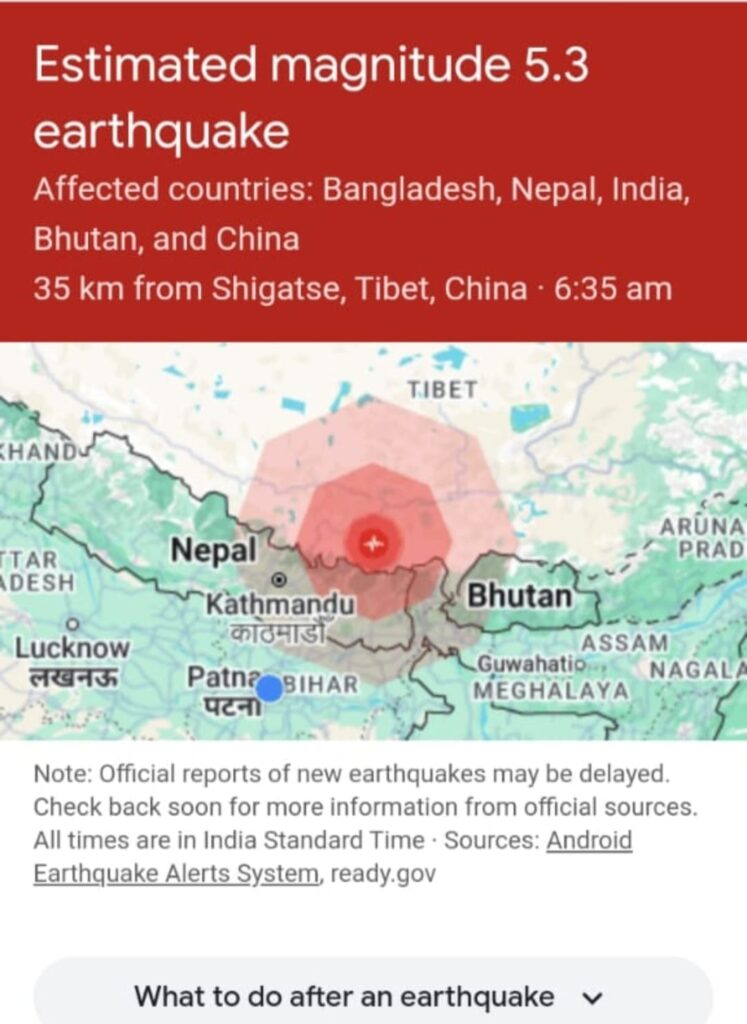 भारत के मौसम विभाग के अनुसार, भूकंप का केंद्र नेपाल की सीमा के पास तिब्बत में था, जहाँ इसकी तीव्रता 7.1 मापी गई। पटना के अलावा सीवान, अररिया, सुपौल और मुजफ्फरपुर में भी झटके महसूस किए गए। हालांकि, भूकंप से किसी तरह के जानमाल के नुकसान की सूचना नहीं है।